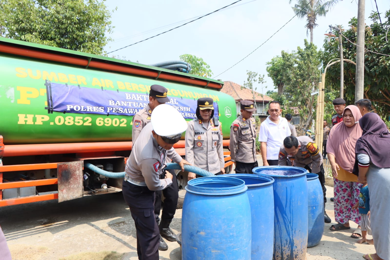 P E S A W A R A N – (PeNa), Air bersih yang menjadi kebutuhan hidup makin sulit didapat ditengah kemarau elnino yang berkepanjangan, sedikitnya dua dusun di Kecamatan Gedong Tataan menjadi sasaran bantuan Kapolres AKBP Maya Henny Hitijahubessy.