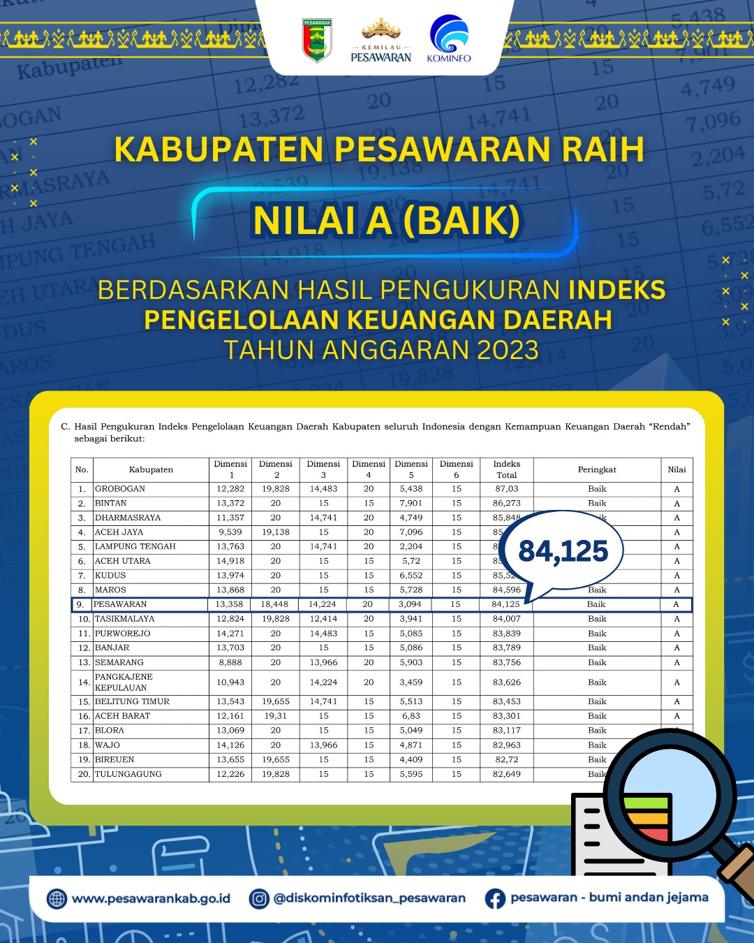 P E S A W A R A N -(PeNa), Soal pengelolaan keuangan, Pemerintah Daerah (Pemda) Kabupaten Pesawaran menerima nilai A dengan predikat ‘Baik’ pada hasil pengukuran Indeks Pengelolaan Keuangan Daerah (IPKD) Tahun Anggaran 2023.