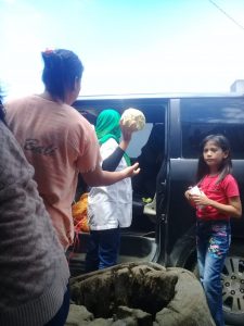 Usai berkeliling melihat kondisi lokasi tsunami dan para pengungsi di Desa Way Muli dan Desa Kunjir, Sofia ikut membagikan beberapa bingkisan kepada para pengungsi. Ia juga selalu membantu ibunya yang memasak di Posko dapur umum relawan guna melayani makan para korban tsunami.