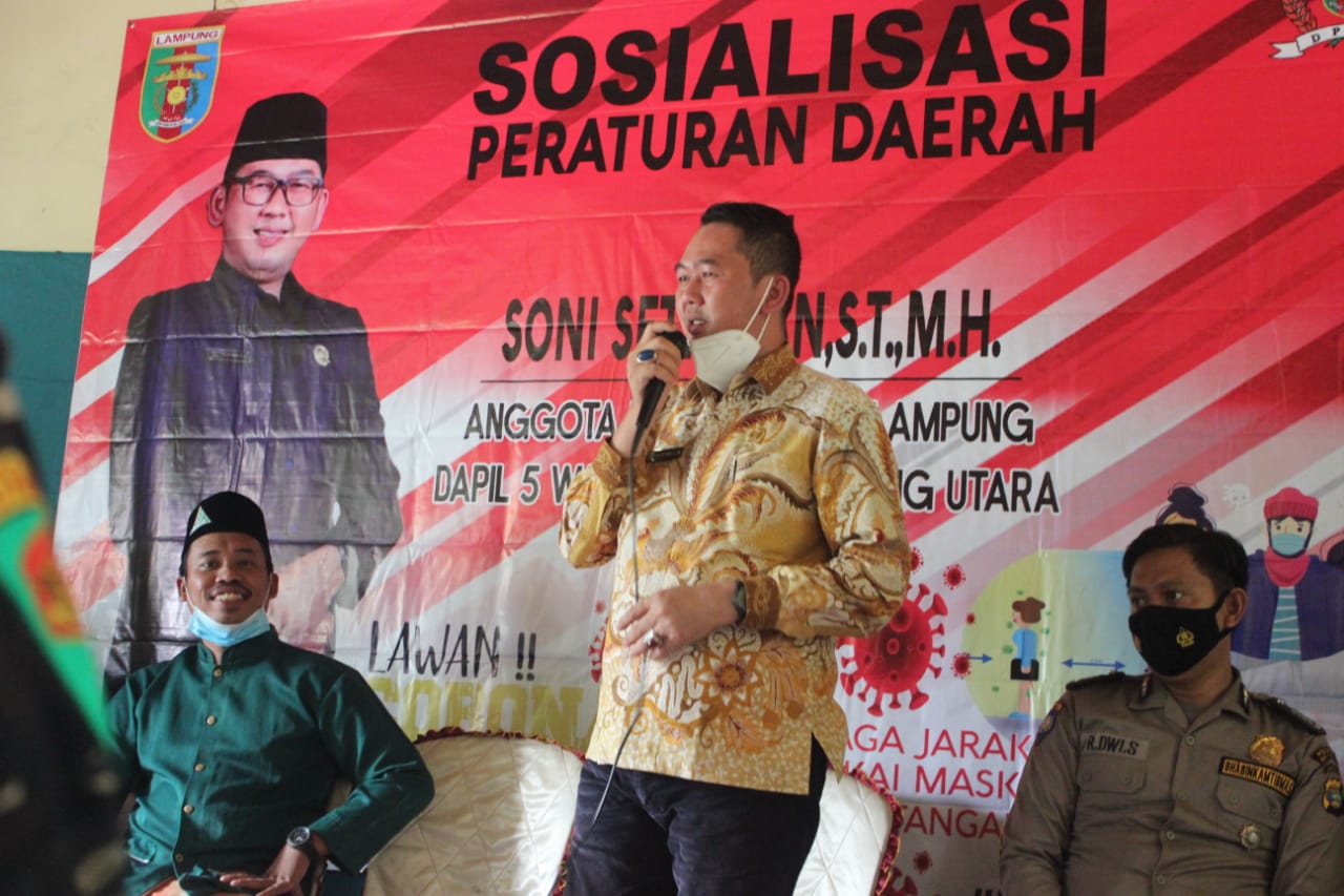 BANDARLAMPUNG (PeNa) – Anggota Dewan Perwakilan Rakyat Daerah (DPRD) Provinsi Lampung Dapil V (Waykanan dan Lampung Utara) Soni Setiawan menggelar sosialisasi peraturan daerah nomor 3 tahun 2020 tentang adaptasi kehidupan baru di Kampung Way Pisang, Kecamatan Way Tuba, Kabupaten Way Kanan, Sabtu (13/3).