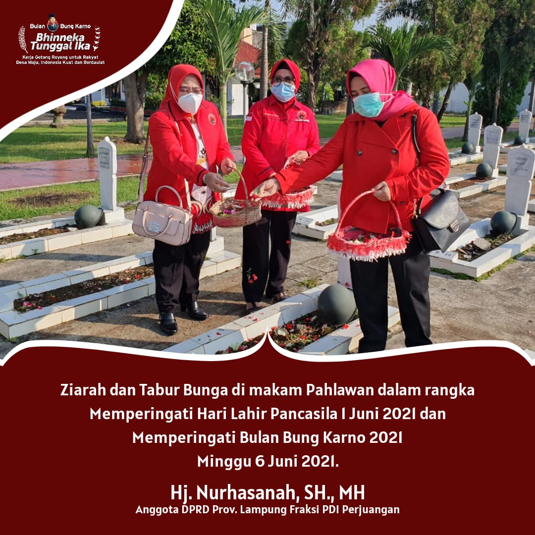 “Ini merupakan bentuk kita untuk memperingati dan mengingat para pahlawan kita yang telah memperjuangkan seluruh tenaga nya untuk kemerdekaan republik ini, selain ziarah kita PDI Perjuangan Lampung juga membersihkan makam-makam pahlawan ini,” kata Srikandi PDI Perjuangan ini, minggu (6/6/2021).
