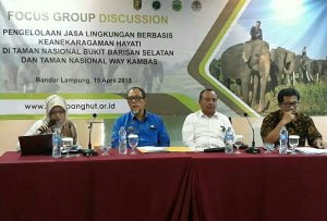 BANDAR LAMPUNG -Dinas Kehutanan Provinsi Lampung bersama Pusat Penelitian dan Pengembangan Hutan, Kementerian Lingkungan Hidup dan Kehutanan menyelenggarakan Focus Group Discussion (FGD) Pengelolaan Jasa Lingkungan Berbasis Keanekaragaman Hayati di Taman Nasional Bukit Barisan Selatan dan Taman Nasional Way Kambas, Kamis (19/4/2018) di Swissbell Hotel Bandar Lampung.