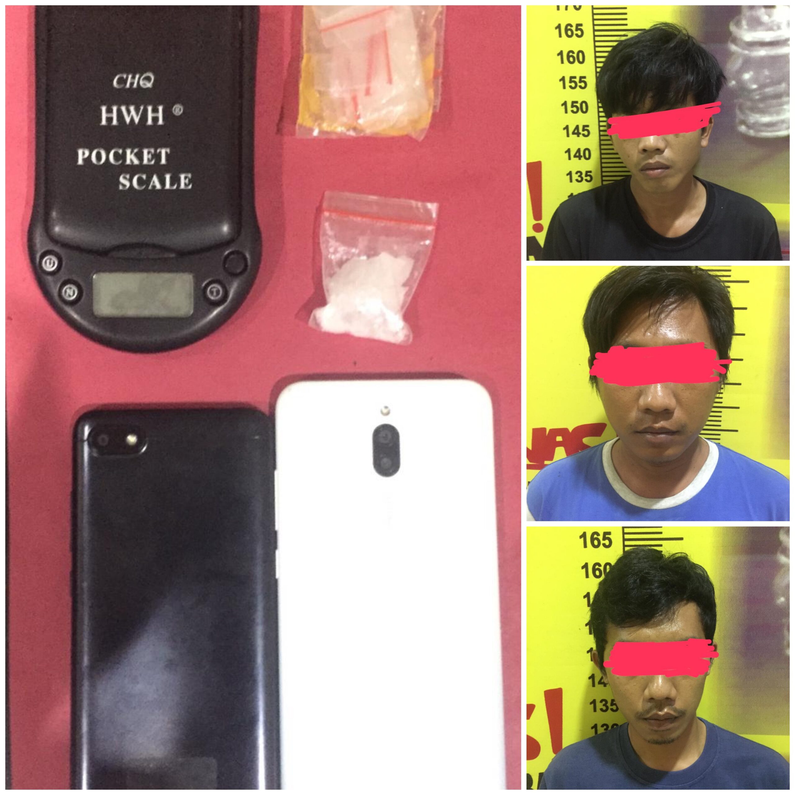 “Petugas mengamankan ketiga pelaku dan barang bukti berupa 1 (satu) bungkus plastik klip bening berisi kristal diduga narkotika jenis sabu seberat 4,90gram,1 (satu) buah timbangan digital warna hitam, 1 (satu) bundel plastik klip kosong, 1( satu) unit hp xiomi warna hitam, 1(satu) unit hp xiomi warna putih,” terang dia.