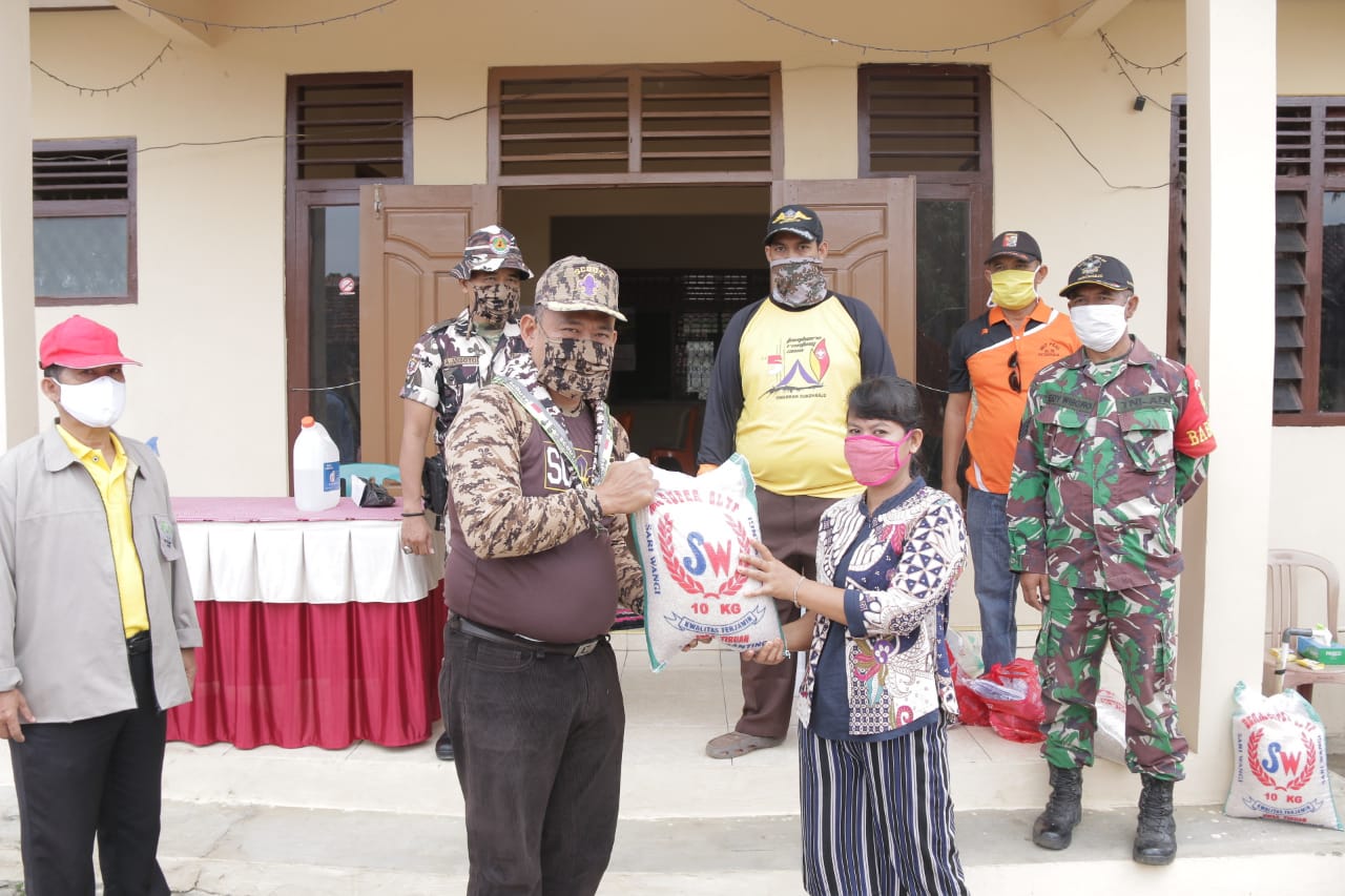 PRINGSEWU-(PeNa),Gerakan Pramuka Kwarcab Pringsewu kembali mengadakan kegiatan bhakti sosial penyemprotan disinfektan dan pembagian masker serta beras kepada masyarakat terdampak wabah Covid-19 di Kecamatan Sukoharjo, Banyumas dan Pagelaran Utara, Ahad (19/04/2020).