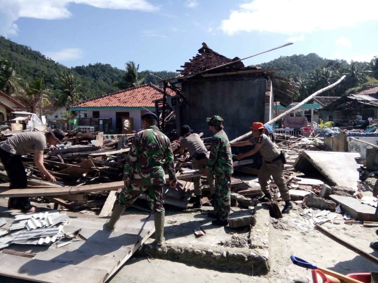 PESAWARAN-(PeNa), Personil TNI, Polri dan Polisi Pamong Praja bersama tenaga konstruksi membersihkan sampah tsunami di Desa Legundi Kecamatan Punduh Pidada, Sabtu (05/01).