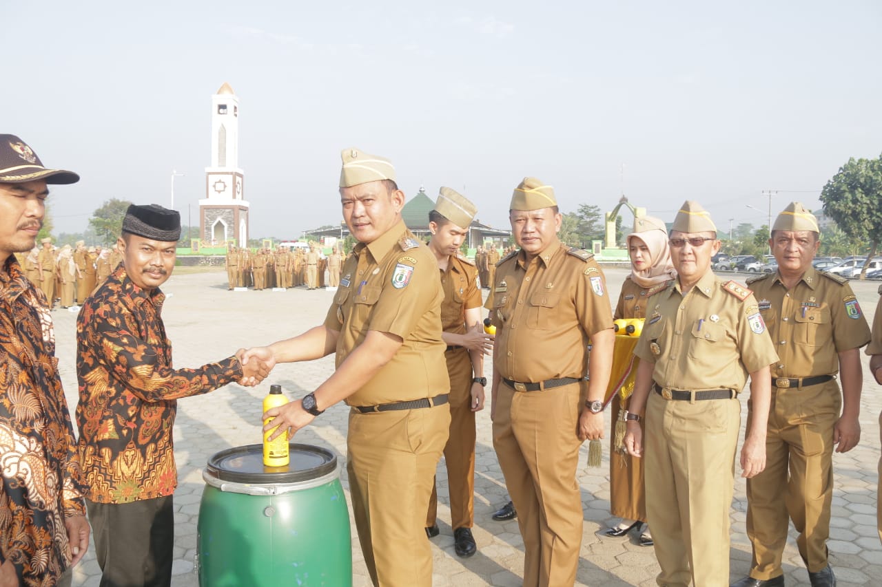 PRINGSEWU-(PeNa), Wakil Bupati Pringsewu Fauzi serahkan hibah peralatan komposter kepada lima kelompok masyarakat saat apel mingguan di Lapangan Pemkab setempat, Senin (22/07).