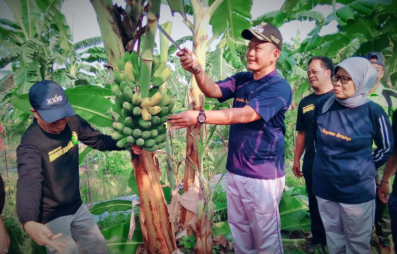 PRINGSEWU-(PeNa),Wakil Bupati Pringsewu Fauzi bersama jajaran Pemerintah Kabupaten Pringsewu melakukan panen perdana pisang jenis Raja Bulu di kebun Nutfah tanaman pisang lab kultur jaringan di Komplek Perkantoran Pemkab setempat, Jumat (15/03).