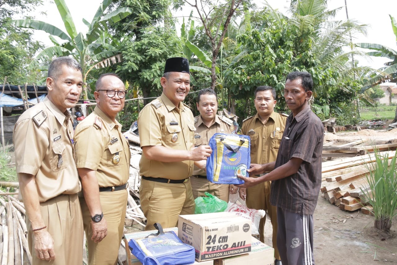 Bantuan berupa sembako dan material bangunan diterima oleh Jumadi yang merupakan korban bencana alam angin puting beliung yang terjadi beberapa hari lalu di desa tersebut.