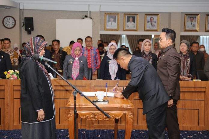 BANDARLAMPUNG – Wakil Gubernur Lampung Chusnunia melantik dan mengambil sumpah jabatan enam Pejabat Pimpinan Tinggi Pratama di Lingkungan Pemerintah Provinsi Lampung, yang dilaksanakan di Ruang Rapat Utama, Kantor Gubernur Lampung, Jum’at (23/6/2023).